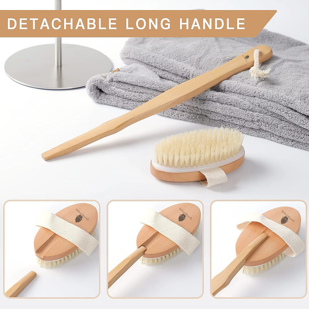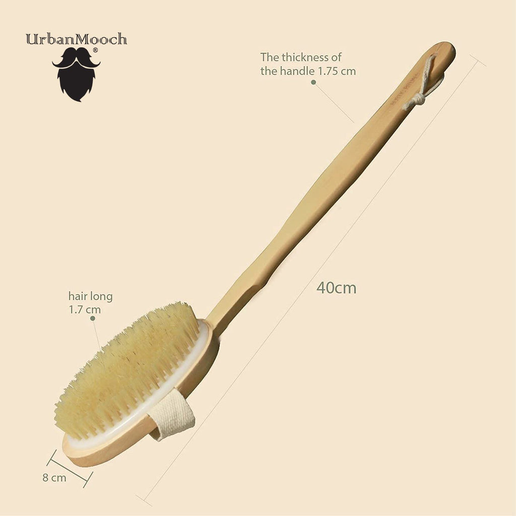 - ERGONOMIC DESIGN: UrbanMooch body brush is 16 inches long which makes it perfect to buff those hard to reach back and legs areas. The bristle part is 5 inches long which is removable. The handle comes with a rope around it for the grip while brushing