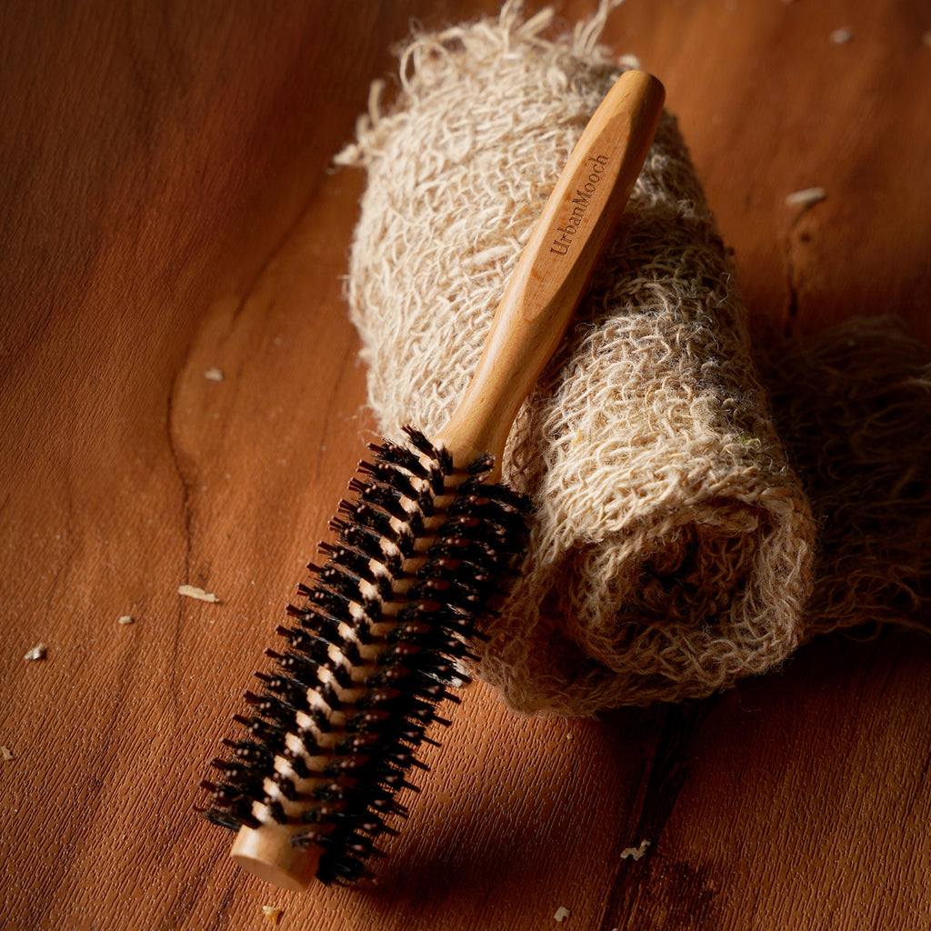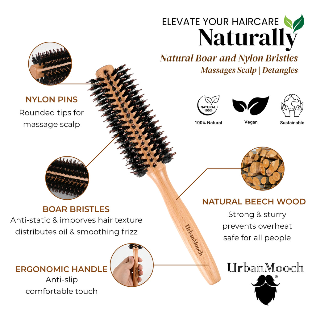 UrbanMooch Boar & Nylon Bristle Hairbrush is the perfect tool for your hair care routine what's more is each round brush is made from cruelty-free nylon blending with natural boar bristles to comfortably and gently detangle hair. Furthermore, The flat bottom part of the wooden round hair brush allows for seamless combing through thick or curly patterns. It's ideal for adding shine and volume to styled hair.