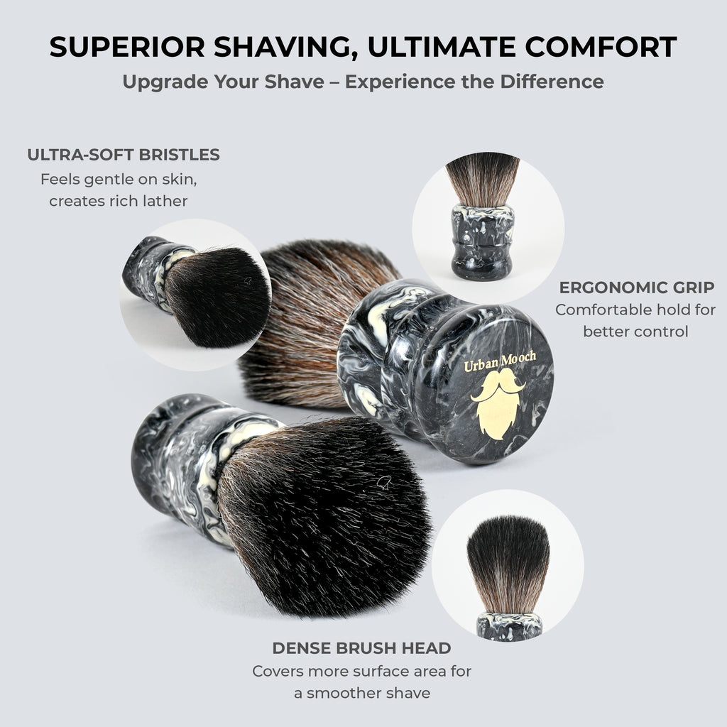 UrbanMooch shaving brush for men is a premium Resin shaving brush crafted with an elegant grey color resin handle and soft and ultra absorbent bristles designed to deliver a smoother and closer shaving experience. The bristles are completely cruelty free while still delivering the shaving experience of a badger hair brush.